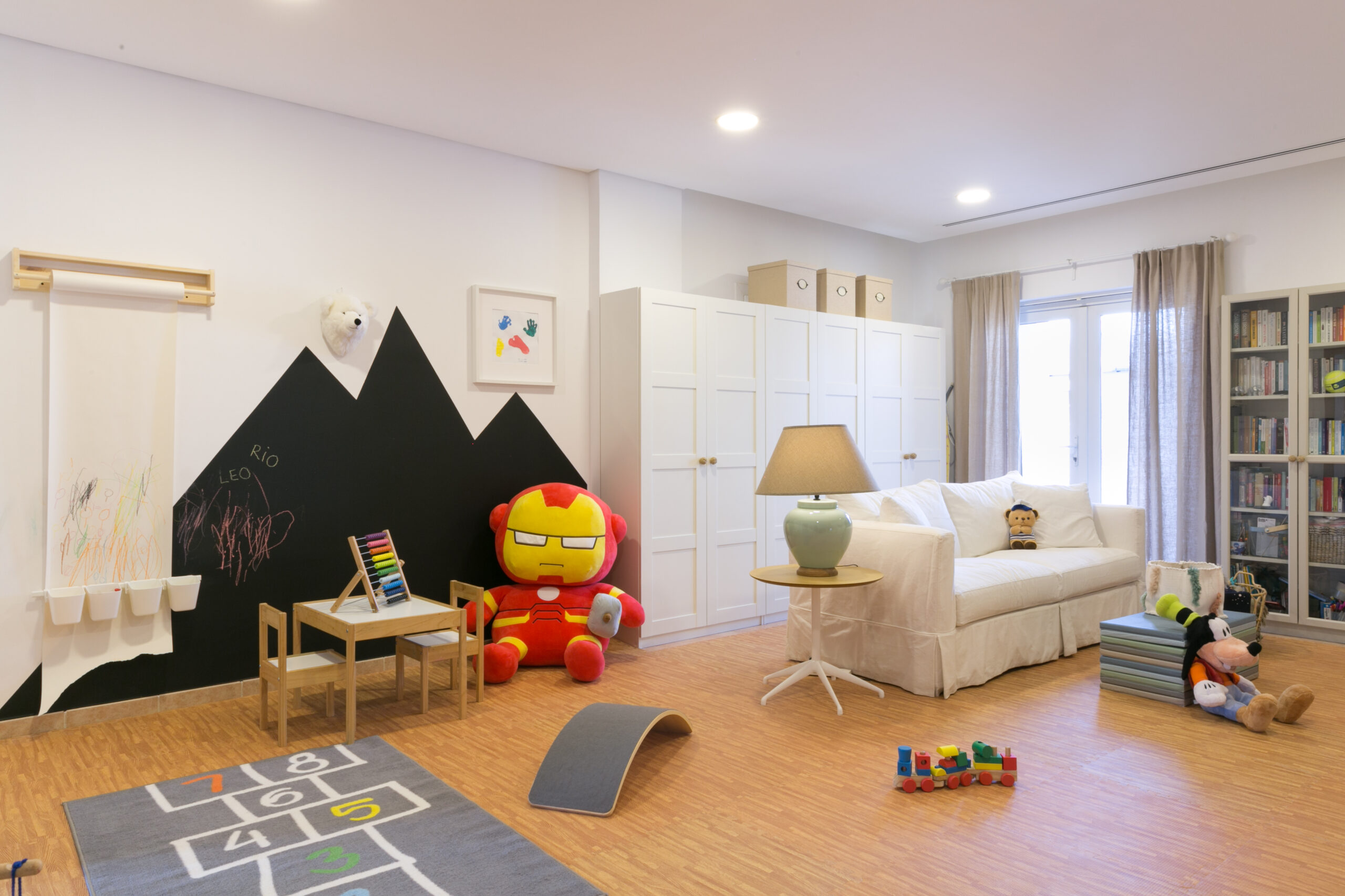 Toddler kids play area with soft flooring and family storage